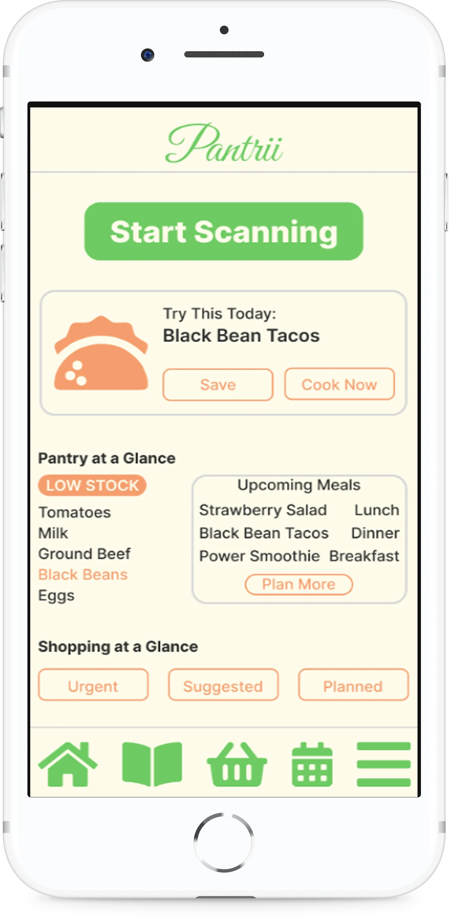 • Mobile mockups demonstrating end-to-end flows from pantry state to meal decision